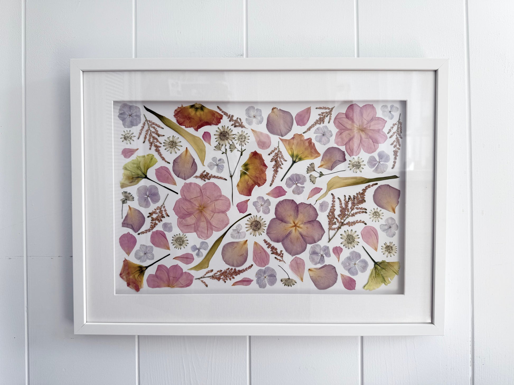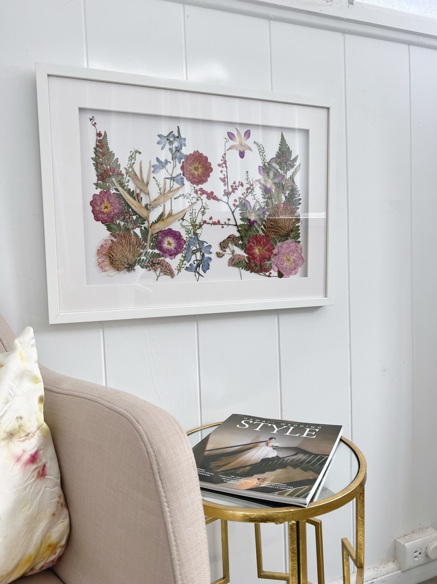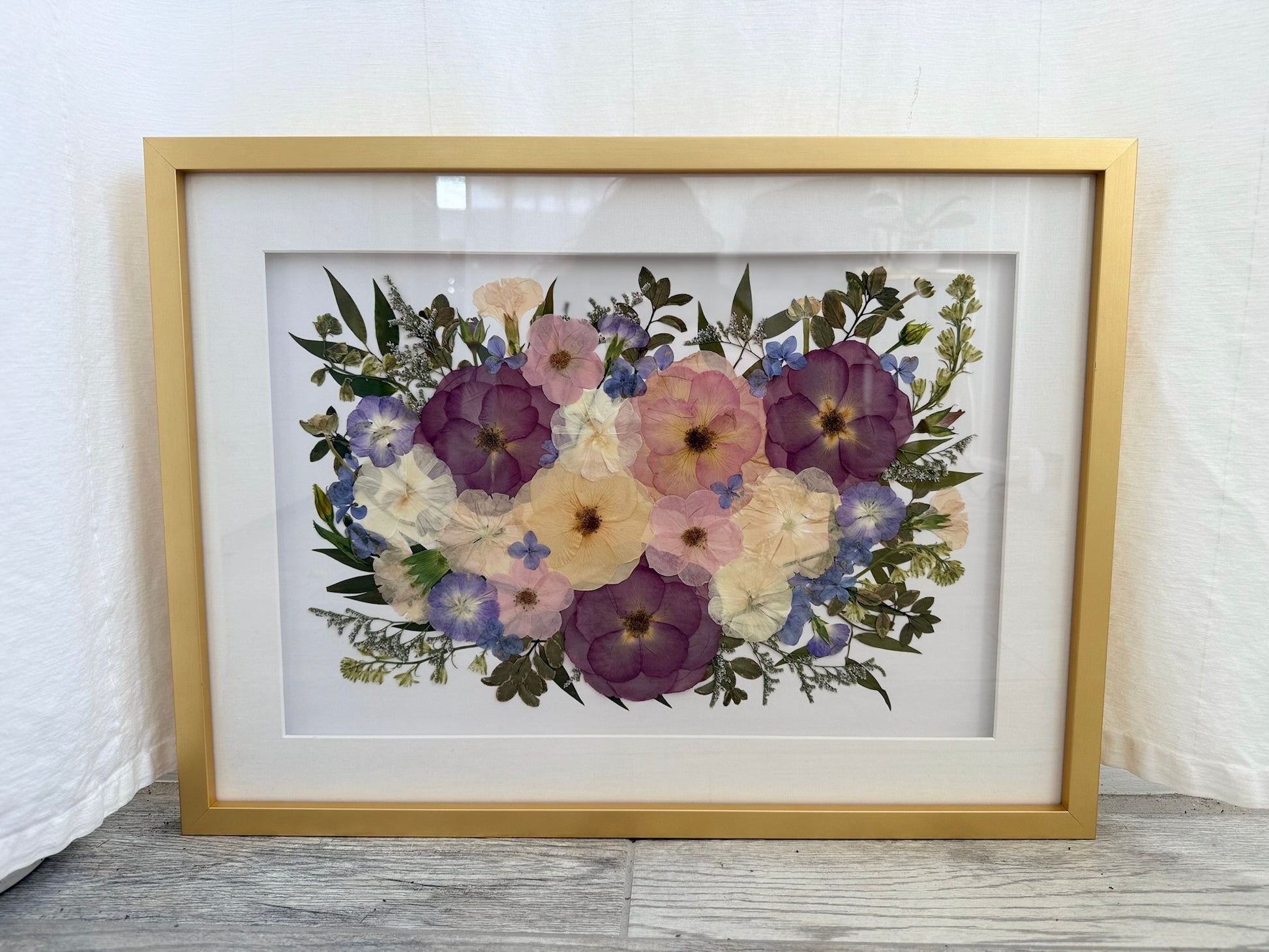 16x22 inch frame with a 12x18 inch botanical design space. Pressed pieces are all custom made and come with professional acid free matting and UV protectant classic glass.