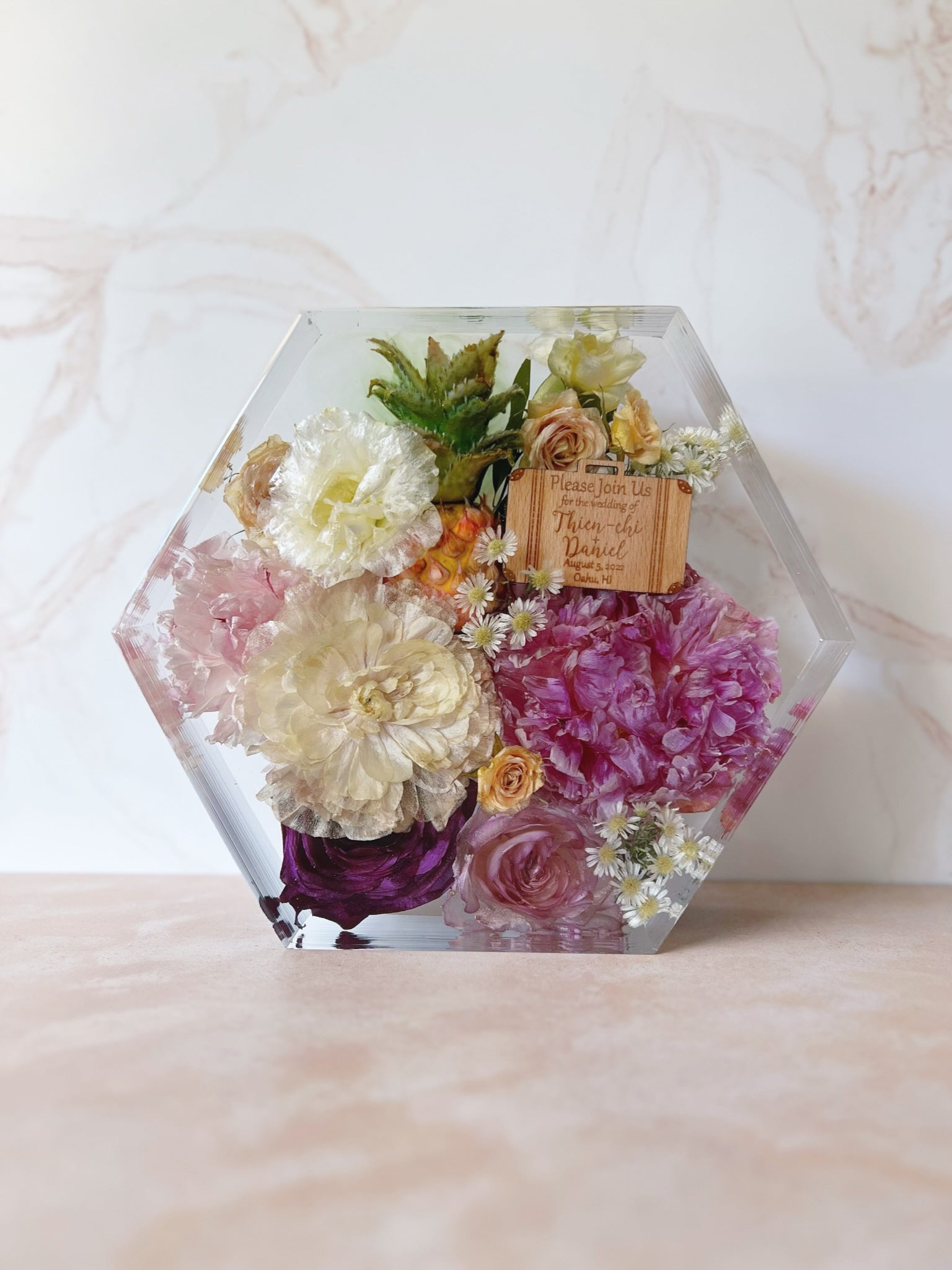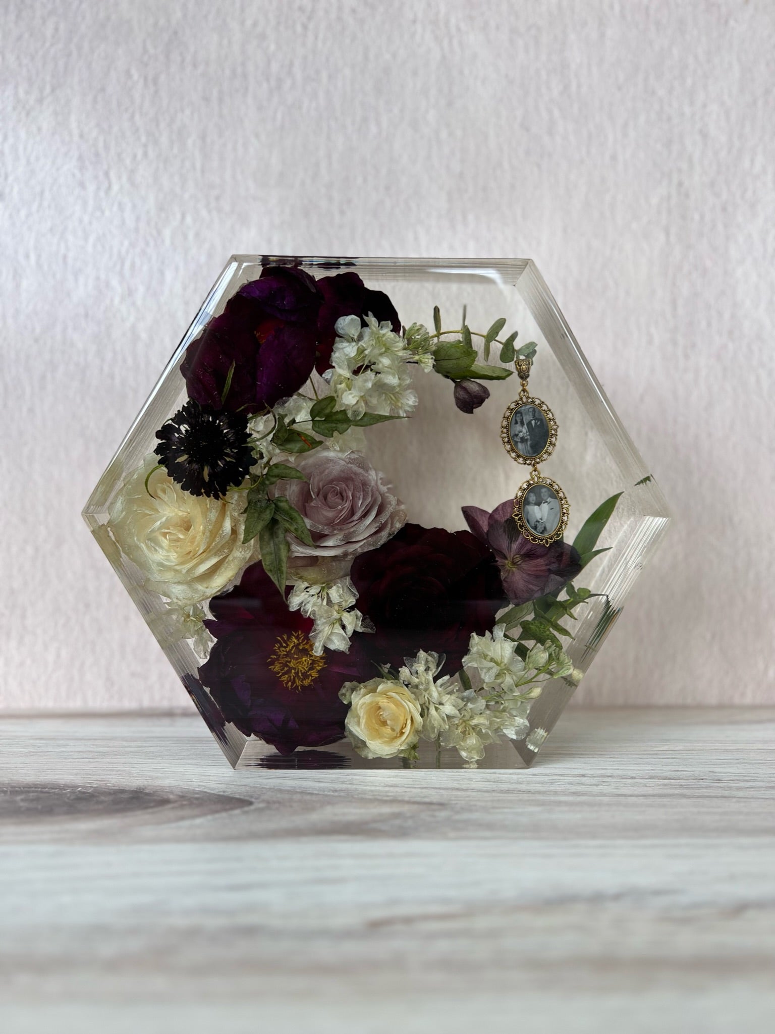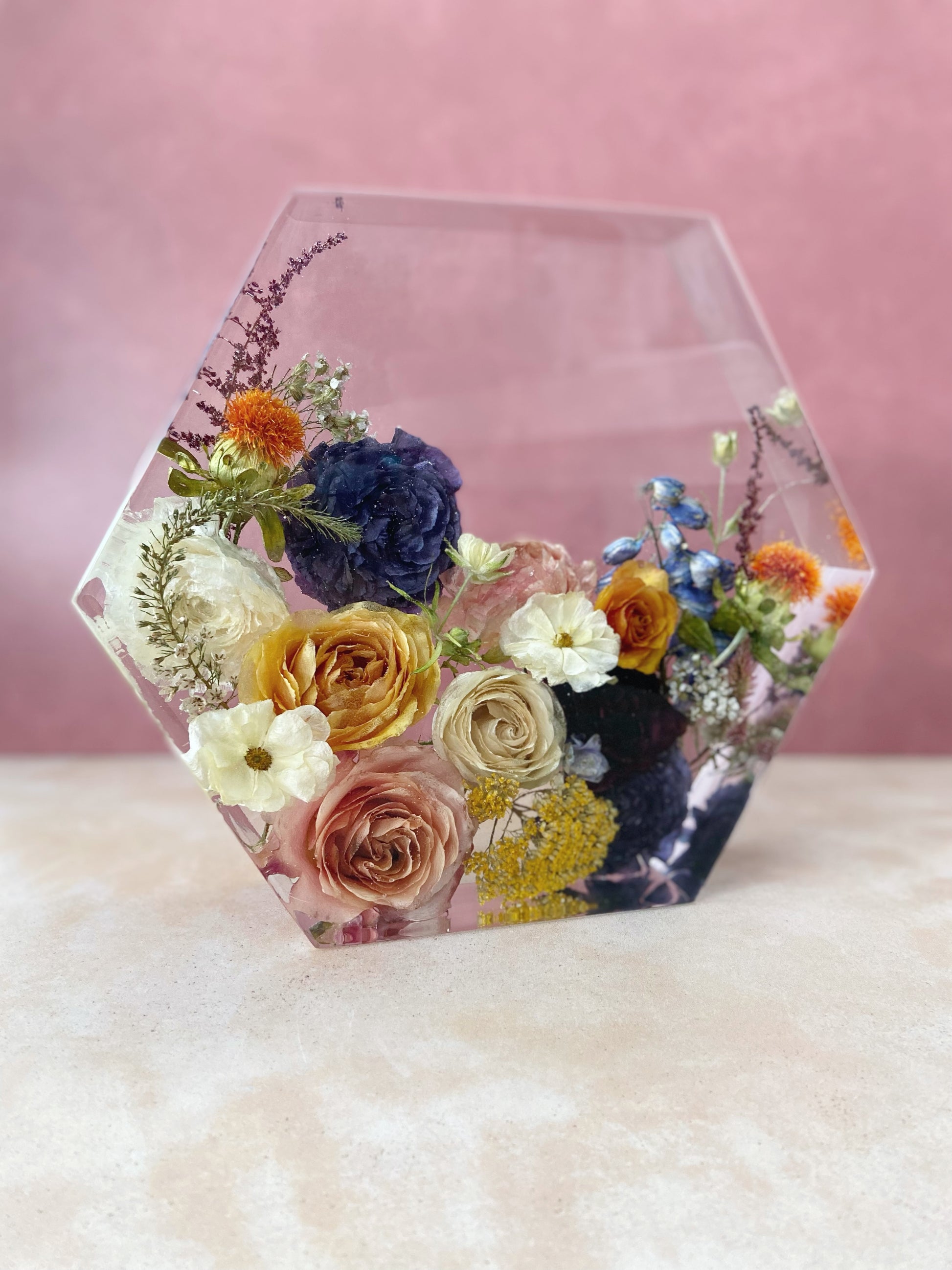 9 inch tall hexagon shaped resin block filled with at least one of each flower in your bouquet, including some of the biggest blooms. This premium box is best for a heavy dresser, bookshelf, or mantle.