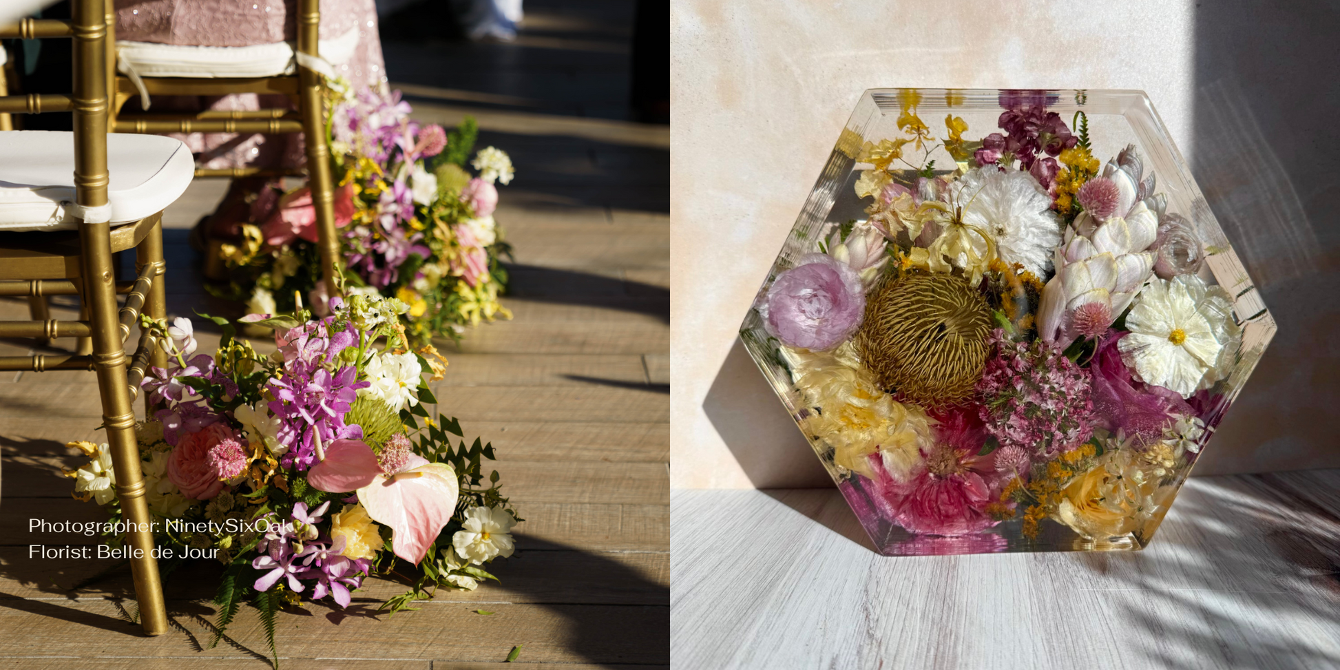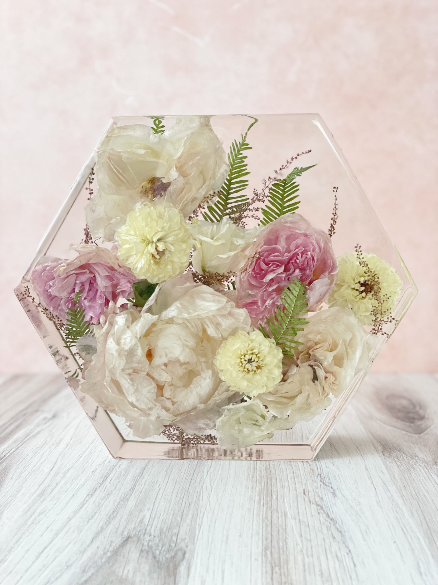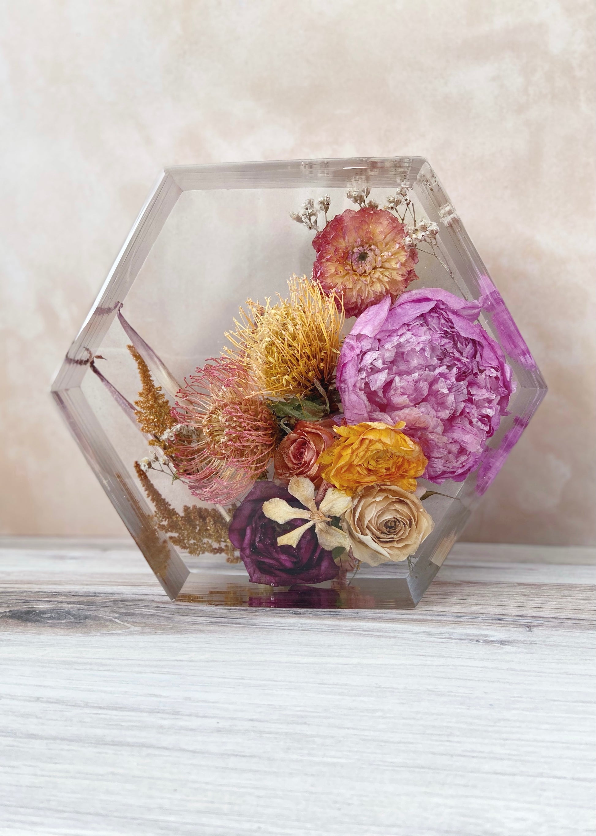 9 inch tall hexagon shaped resin block filled with at least one of each flower in your bouquet, including some of the biggest blooms. This premium box is best for a heavy dresser, bookshelf, or mantle.